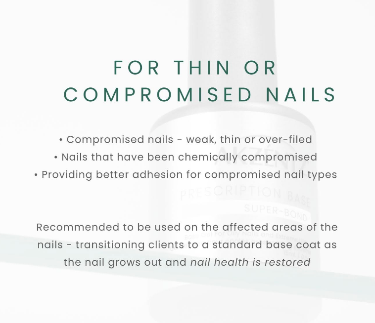 SUPER-BOND: Introducing Super-Bond. An all-new, high-performance Prescription Base designed specifically for clients with extremely oily or moisture-prone nails, including those with hyperhidrosis. Formulated with a carefully considered concentration of Acrylic Acid, Super-Bond provides maximum adhesion and lowers the pH of the nail plate. It delivers exceptional wear in cases where standard base coats may lift or peel. Cure 30 seconds