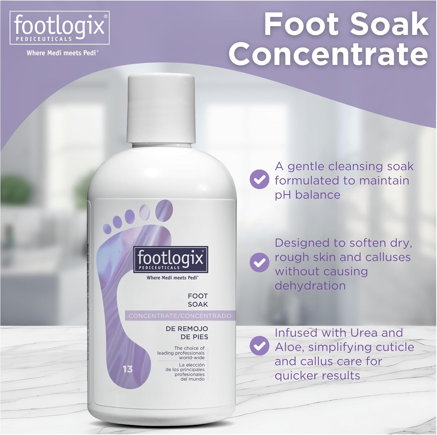 A pH balanced, gentle, cleansing foot soak, which helps soften dry, rough skin without dehydrating the skin while soaking. Hygienic pump dispenser helps to prevent contamination.