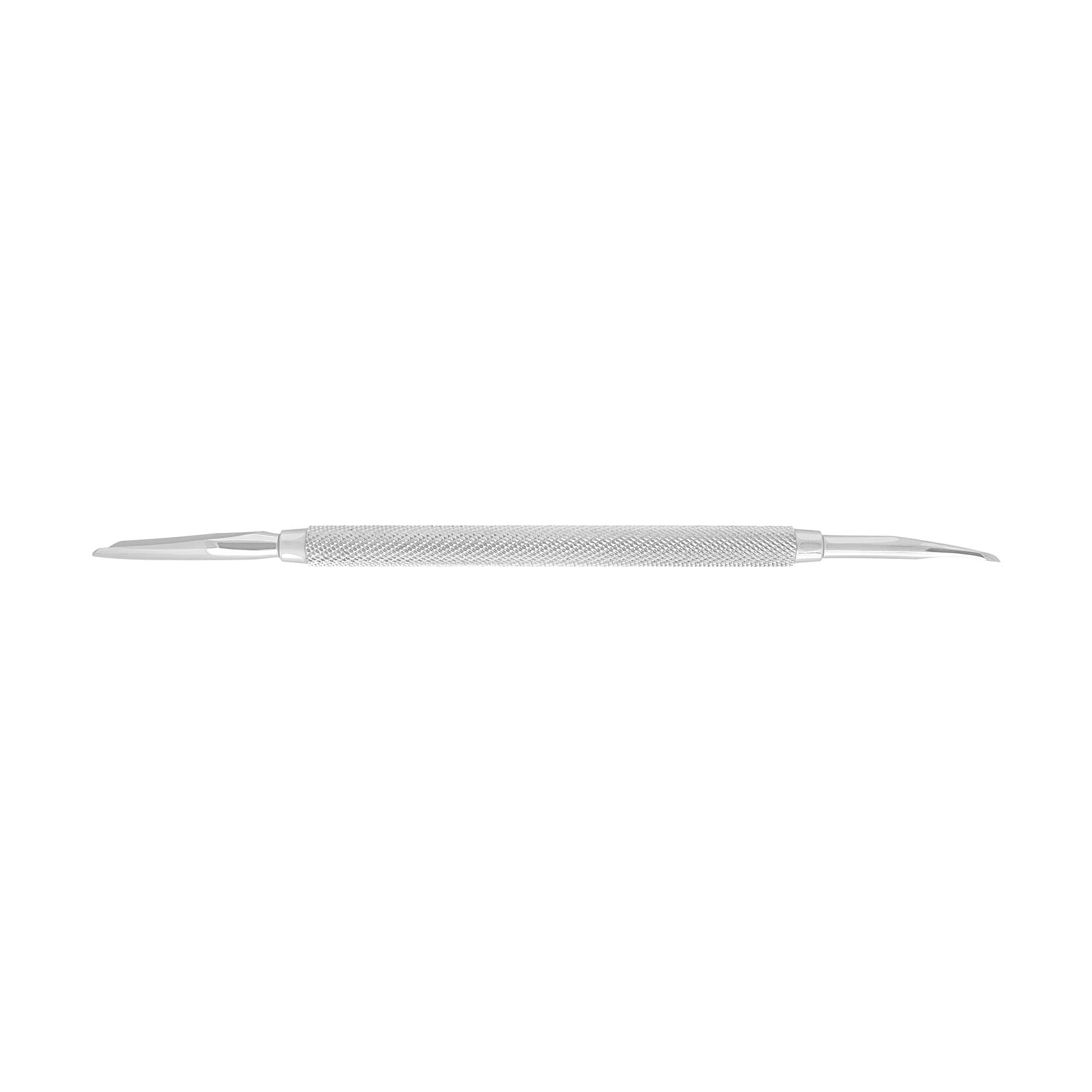 P-05: Standard length pusher with a spatula and a hatchet. The spatula is designed to push the cuticle away for further removal with scissors or wire cutters. The hatchet is well suited for cleaning the nail from pterygium and surface treatment at the side rollers and the inside of the free edge.