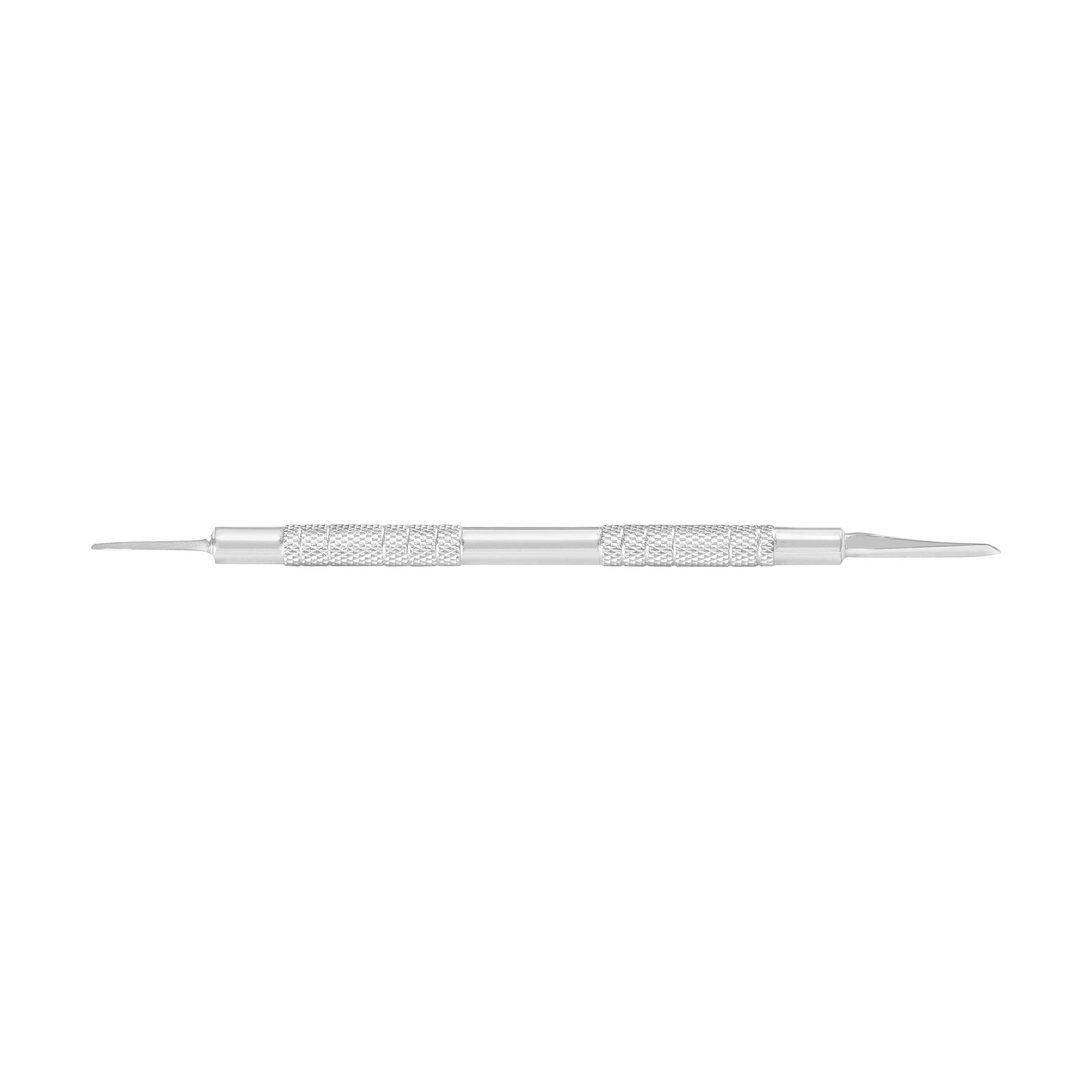 P-06: Standard length pusher with a spatula and a hatchet. The spatula is designed to push the cuticle away for further removal with scissors or nippers. The hatchet is well suited for cleaning the nail from pterygium and surface treatment at the side rollers and the inside of the free edge.
