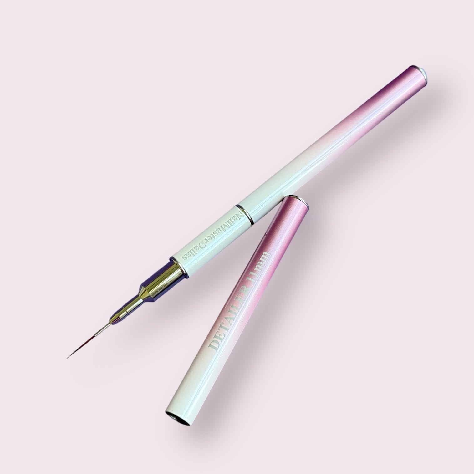 It has two working ends: one end is a 11mm DETAILER, a thin brush for fine lines and fine spread under the cuticle or side walls - designed and perfected over time and many trial and errors. The 9mm length is perfect, bristles were well lined and adjusted to be not too soft nor too stiff so that you can make perfect designs with thin lines or work in tight spaces,