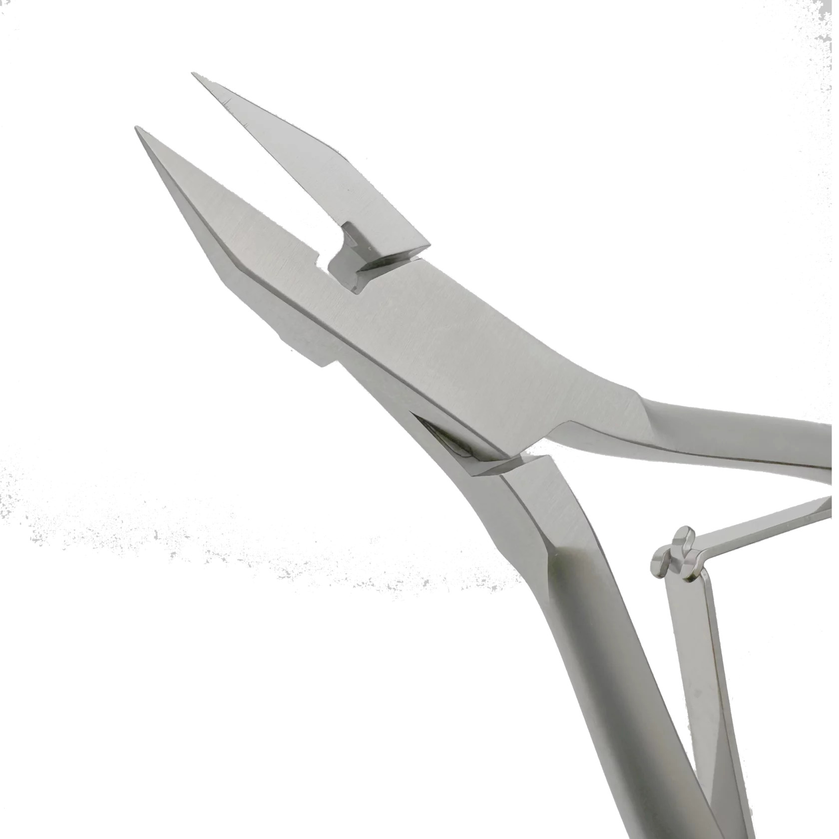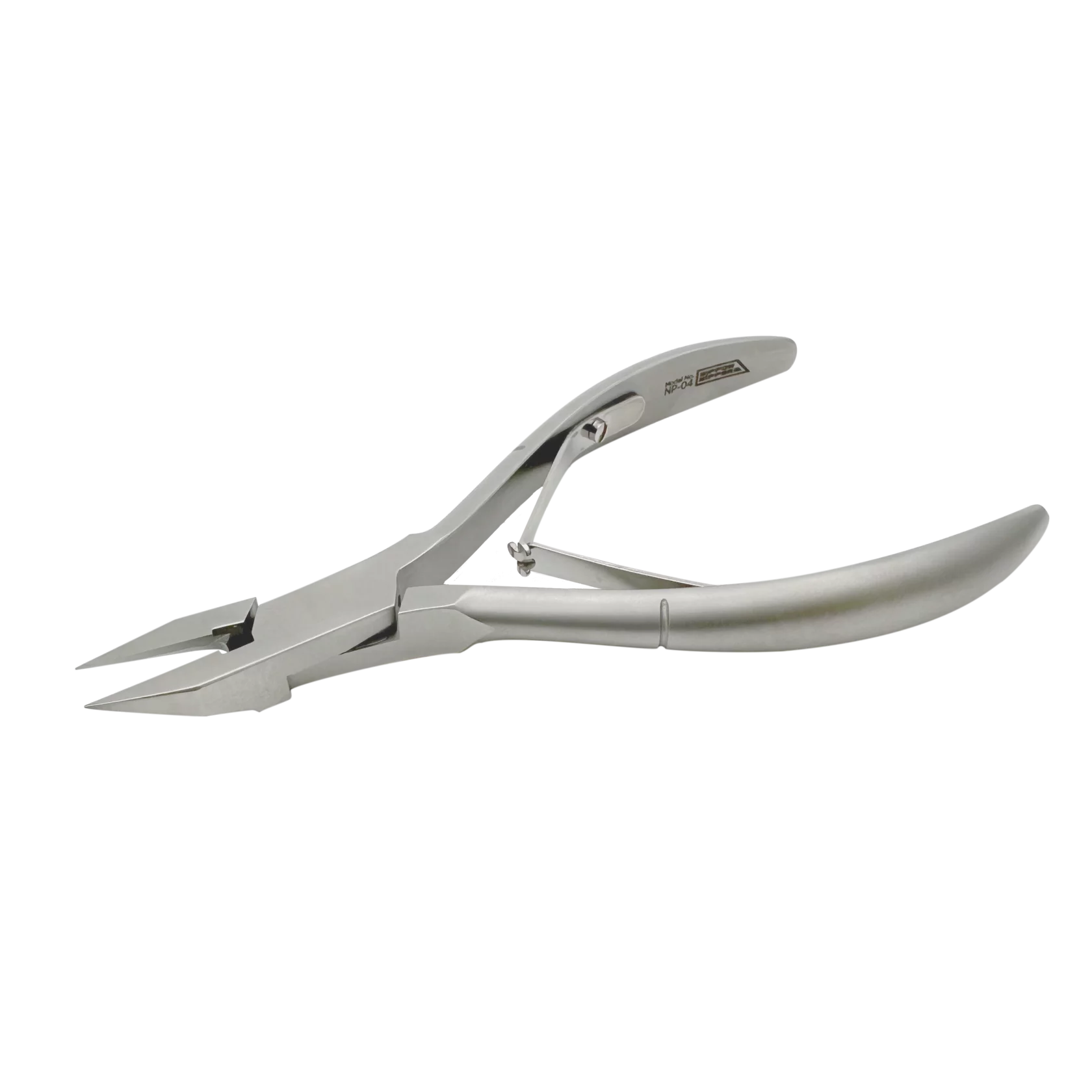 Long-handled  NP-04 nail nippers are designed to handle ingrown toenails and clean the surrounding areas. These nippers are designed for skin cut-outs in the area of ingrowth. Narrow and sharp blades help to work in the hard-to-reach area of the nail roller in the area of ingrowth of the nail. The tips of the nippers do not prick, they are slightly rounded for safer movements. These nippers are NOT recommended for cutting nails. Nippers are intended strictly for professional use by podiatrists or pedicurists. The tool is hand- sharpened and fully ready for use. The nippers are made of stainless steel hardened to a strength of 53-55 HRC. Designed for professional use, they can be subjected to all types of sanitary treatment with pH>7 to prevent discoloration.