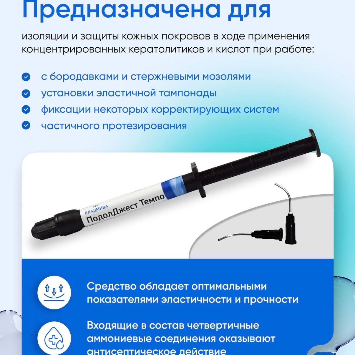 TEMPO Multipurpose UV-Curable Paste: a specially formulated UV-curable compound for isolating boundaries of calluses and warts, liquid tamponade of ingrown toenails, corrective modeling of the damaged nail plates, unloading problem areas and painful points of the foot, repairs and fixation of corrective systems. This paste after UV cure has unique optimal combination of elastisity, strength, and longevity.
