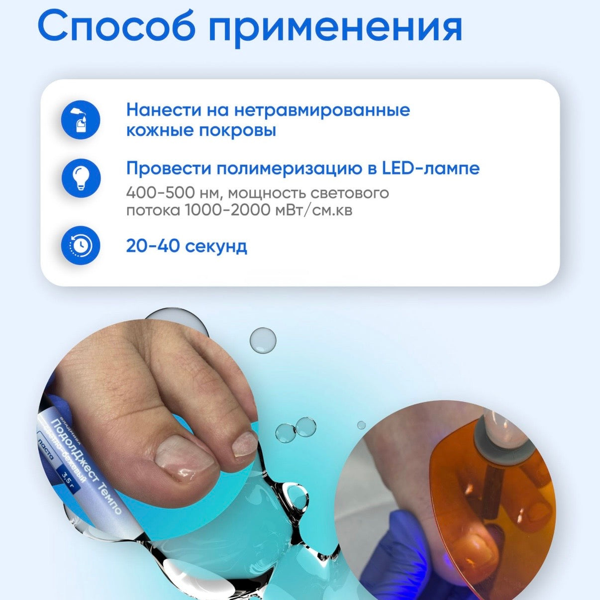 Prepare, clean, and file this area of application. It is best to use PodolJest Tempo Paste with a strong dental UV light for best results. Select the appropriate amount of the paste. Fill out or spread the paste thoroughly around the area of application and UV-cure for 20-45 sec - you may increase curing time if the layer is thick.