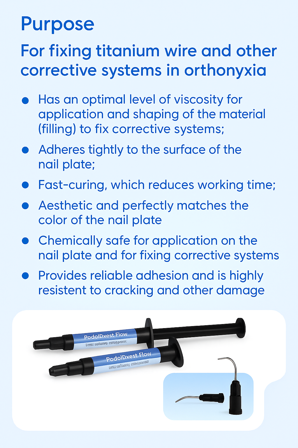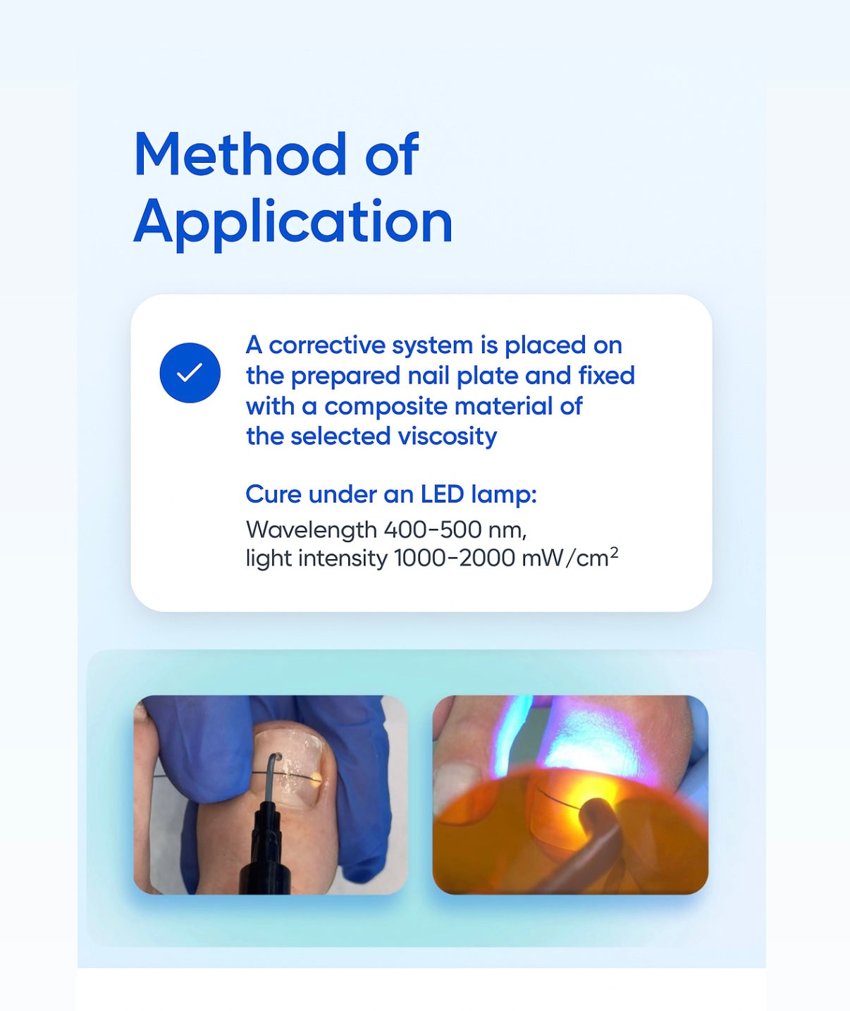 Method of application: Apply the required amount of the composite to the prepared surface of the nail plate, then cure under a lamp with a wavelength of 450–500 nm for 20–40 seconds. If necessary, perform final finishing using bits in the traditional way.